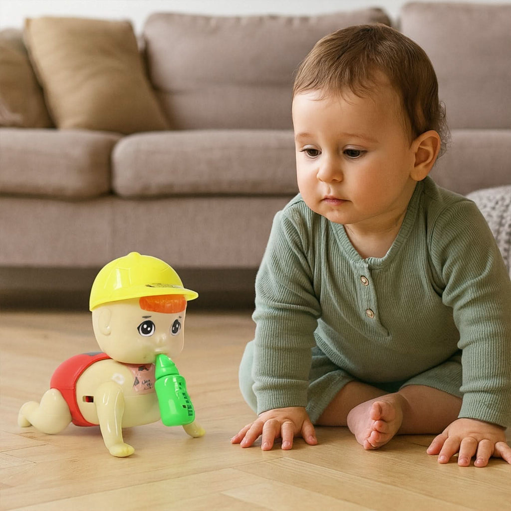 Introduce your little one to fun and movement with this Crawling Baby Interactive Toy, designed to engage young minds through visual motion, sound, and light. This adorable baby figure comes with a feeding bottle and features delightful crawling action that encourages toddlers to move along with it. Equipped with musical sound effects and gentle flashing lights, this battery-operated toy helps improve motor skills, hand-eye coordination, and curiosity in toddlers.